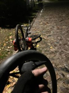Nach einem ausgiebigen Schlaf ging es auf den letzten Abschnitt über 93 Kilometer. „Endlich alles dabei: Verfahren, in den Matsch getreten, auch mal Regen, und ein Leck im Reifen. Herrlich – und Nic hat immer angefeuert und den Starterbeutel personalisiert. Danke.“