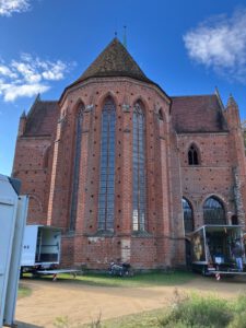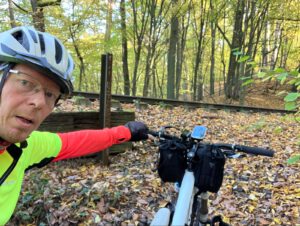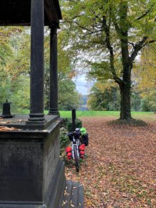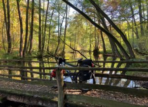 Warum einem vorgegebenen Track folgen? Als erfahrender Reiseradler, würde ich viele Tourentscheidungen anders treffen. Oft die bessere Straße dem schöneren Weg vorziehen, denn man will ja irgendwann ankommen. Anders hier. Der Weg ist das Ziel. Auch hier will man ankommen, aber man lässt die schönen Wege nicht aus. Und sie sind wirklich schön und teilweise sehr beschwerlich. Auf der traumhaften Strecke entlang einer Kette von Mooren mit urigen Robinienwäldern nördlich von Leuenberg gab es so viele umgstürzte Bäume, die nur geübte MTBiker überspringen können (ich also nicht), dass ich vergessen habe zu fotografieren. Aber genau diese Mischung aus Naturerfahrung und Herausforderung habe ich gesucht. Andererseits, dem Navi zu folgen ist zwar bei diesem Format unvermeidlich, für mich aber ungewohnt und mit Schwierigkeiten verbunden. Mir fehlt der Überblick, den mir die Papierkarte verschaffen kann. Letztlich ist die Wahl der Wege für den OMBU an nahezu allen Stellen ein Hochgenuss für Augen und Ohren – Vogelgezwischer, der Ruf des Eichelhähers, dass Bellen der Kraniche. Am ersten Morgen hat mich ein Schwarm ziehender Gänse geweckt. Nicht zu vergessen auch die geräuschlosen Rehe, die mehrfach meinen Weg wechselten, anders als das Wild, welches sich in der Nacht durch Knacken und Grunzen bemerkbar machte und unsichtbar blieb.